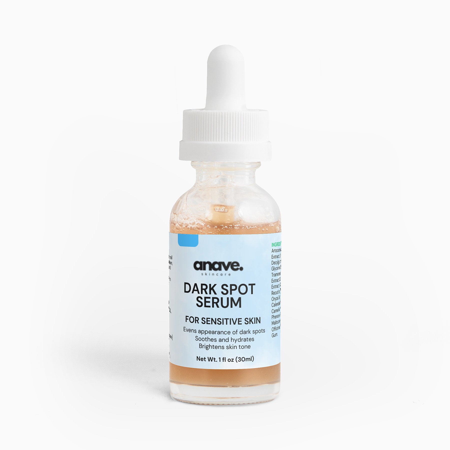 Introducing our Dark Spot Serum, designed for sensitive skin. Hydration sets the stage for targeted dark spot reduction. Natural extracts work together to brighten and even skin tone while providing soothing repair.
